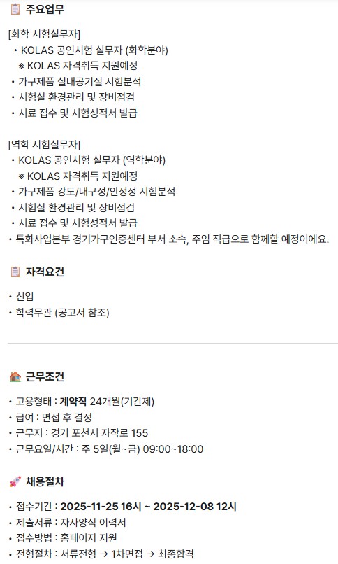 경기가구인증센터에서 시험분석(역학/화학) 실무자를 채용합니다.